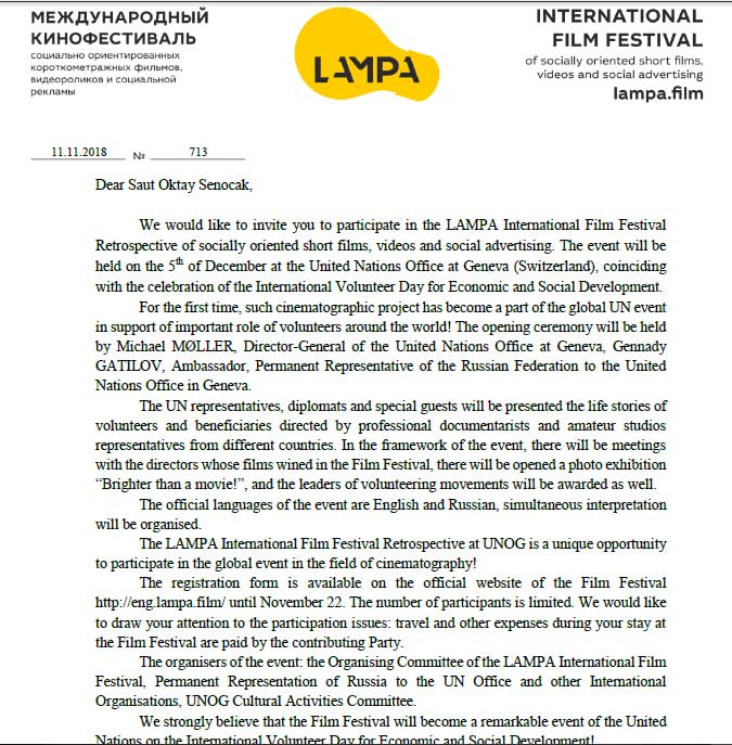 Rusya'nın Perm şehrinde, «LAMPA» International Film Festival'nde finale kalan “Derse Devam” filmi ve yönetmeni Suat Oktay Şenocak bu başarısıyla birlikte Cenevre’den davet aldı. İsviçre’nin Cenevre kentinde bulunan Birleşmiş Milletler ofisinde 5 Aralık'ta düzenlenecek International Volunteer Day for Economic and Social Development’te gösterilecek “Derse Devam” ile birlikte ülkemizi ve kentimizi temsil edeceğini söyleyen Şenocak, “Bursa’dan çıkmış bir yönetmen olarak böylesi anlamlı bir etkinlikte ülkemi temsil edecek olmanın gurunu yaşıyorum” dedi. Kendisiyle birlikte İzmirli genç yönetmen Çağatay Çelikbaş’ın “Saklı Cennet” adlı belgeseli de ülkemiz adına etkinlikte yer alacağını ifade eden Şenocak, Derya Gümral, Tarık Şenocak ve İlyas Sarı’nın rol aldığı, Saibe Durmaz Özel Eğitim Meslek Okulu ile birlikte çekilen, özel eğitim öğretmeni Uğur Armutçu’nun “Derse Devam” adlı söz gösterisinden uyarladığı kısa filmi daha önce de Sırbistan’ın Novi Sad şehrinde "Perspektifleri Değiştiren Film / FILM THAT CHANGES PERSPECTIVE" ödülüne layık görülmüştü…