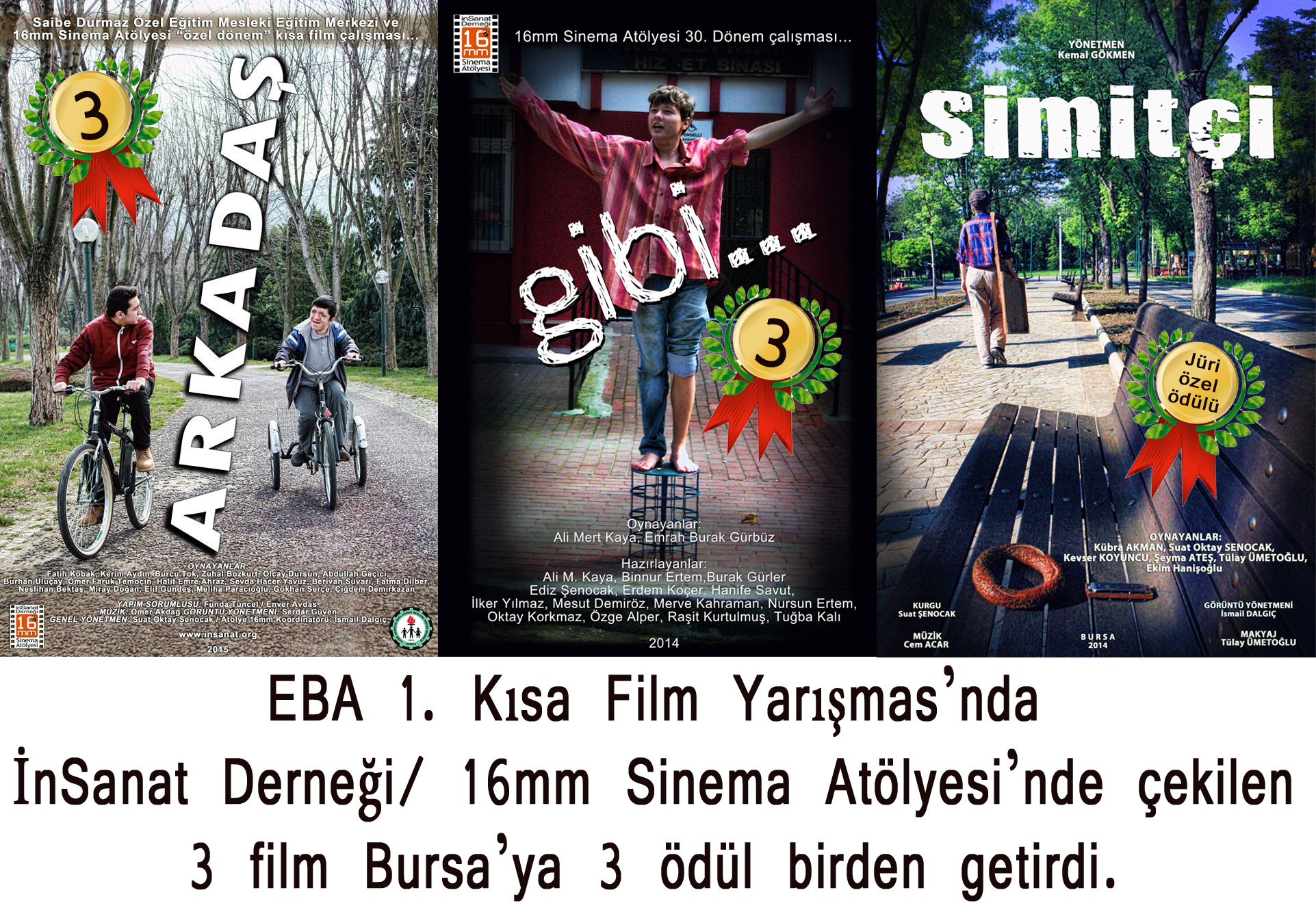 Milli Eğitim Bakanlığı bünyesinde düzenlenen “EBA Okullararası 1. Kısa Film Yarışması’nda, İnSanat Derneği/ 16mm Sinema Atölyesi’nde çekilen 3 film Bursa’ya 3 ödül birden getirdi. Saibe Durmaz Özel İş Okulu’nun özel öğrencileriyle, Funda Tuncel koordinatörlüğünde öğretmen kategorisinde “Arkadaş”, liseli karma grupla çekilen ve Ediz Şenocak adına yarışan “Gibi…” ise öğrenci kategorisinde 3. olma başarısını gösterdi. Ergin Ağaç Ticaret Meslek Lisesi öğrencileri ile öğretmen Kemal Gökmen koordinatörlüğünde çekilen “Simitçi” filmi ise öğretmen kategorisinde özel ödüle layık görüldü. Milli Eğitim Bakanlığı Yenilik ve Eğitim Teknolojileri Genel Müdürlüğü’nün düzenlediği ve Türkiye çapında çok sayıda öğrenci ve öğretmenin filmlerinin katıldığı EBA 1.Kısa Film Yarışması’nın seçici kurulunda ise Türk sinemasının önemli yönetmenleri Semih Kaplanoğlu ve Derviş Zaim’in yansı sıra, Cem Gençoğlu, Sadık Yalsızuçanlar ile Erol Nezih Orhon yer aldı. Yarışmanın ödül töreni 27 Mayıs günü Ankara’da yapılacak.