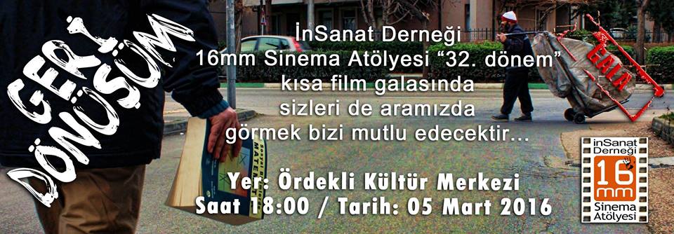 İnSanat Derneği 16mm Sinema Atölyesi 32. Dönem kısa filmi çekildi. Alper Sina Sağlam, Hasan Bakır ve Osman Korkmaz'dan oluşan 32. dönem "Geri Dönüşüm" adlı 12 dakikalık bir çalışma yapıldı. Üniversite öğrencisi şımarık bir genç ile geri dönüşümcü olarak, çöplerden topladığı atıklarla hayatını sürüdüren orta yaşlı bir adamın farkında olamadan kesişen hayatlarını anlatan kısa filmin galası 5 Mart 2016 Cumartesi akşamı 18:00 / 20:00 saatleri arasında yapılacak. Her zaman olduğu gibi bu etkinliğe de sanatseverler ücretsiz katılabilecek. Galada Geri Dönüşüm kısa filmi gösterimi yapılacak ve katılımcılara çektikleri filmin DVD'si ile katılım belgeleri sunulacak.